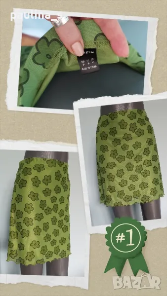 3️⃣. Колаж / L / 2XL - Зелена пола на цветя "Shein". Цената е крайна 24,99лв / 12,5 евро . Една бройка, нова Зелена пола с хастар и с флорален принт от Шейн. Полата е нова, без дефекти и етикет(за това е в състояние - използвано). Една бройка е, става за посочените размери. Моделът е леко разкроен.