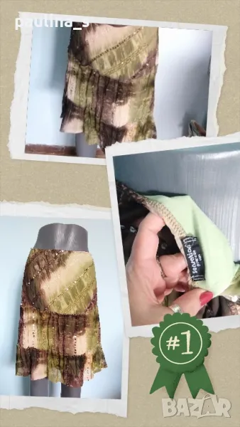1️⃣. Колаж / M / 2XL - "Sensation" pour elle. Цената е крайна 14,99лв / 7,5 евро. Копринена дизайнерска пола с елстичен хастар и декорации от пайети. Материята е копринена органза в Армни стайл - стои измачкана, декорациите са от пайети и бродерии със сатенени конци, атрактивна дреха. Полата, като цяло, има еластичност и покрива няколко размера. Без дефекти и етикет.