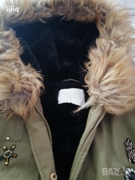 Доказана марка, страхотен дизайн и цвят, пухкава топла подплата, страхотна качулка, ширина от мишница до мишница 56 см, ръкав 61 см, дължина при гърба 69 см, някои от украсите са паднали