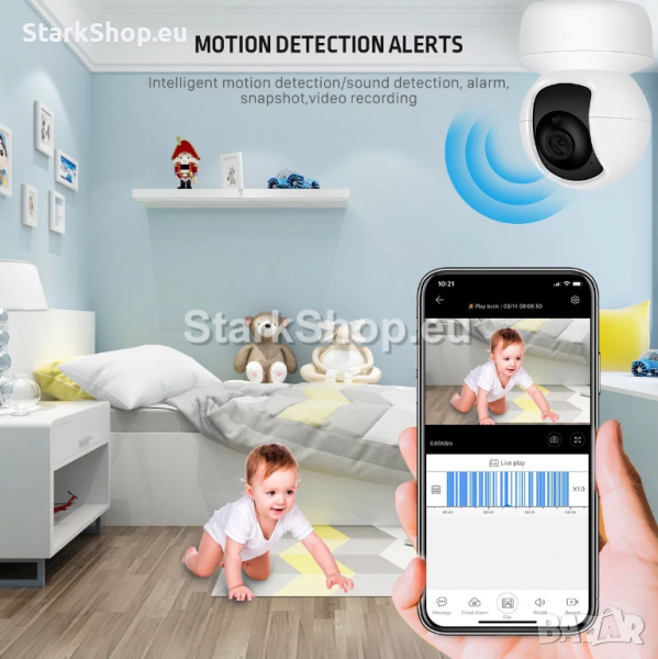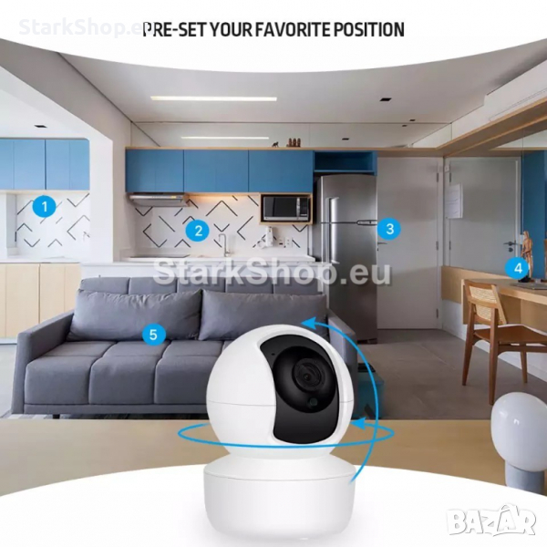 BabyCam WiFI вътрешна камера бебефон с 360° видимост означава пълна защита на дома. Двойната глава на двигателя позволява на камерата да се върти и да заснема пълен 360 ° хоризонтален и 96 ° вертикален изглед. Удароустойчивият дизайн и дизайна позволяват това въртене да се случва плавно и безшумно.