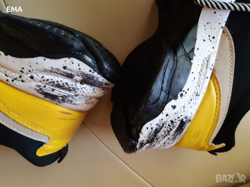Като нови, на подметката отвътре имат от почукването на стъпалата малки забележки, които не се забелязват, защото е цветна- пръскана подметката-приложени снимки.