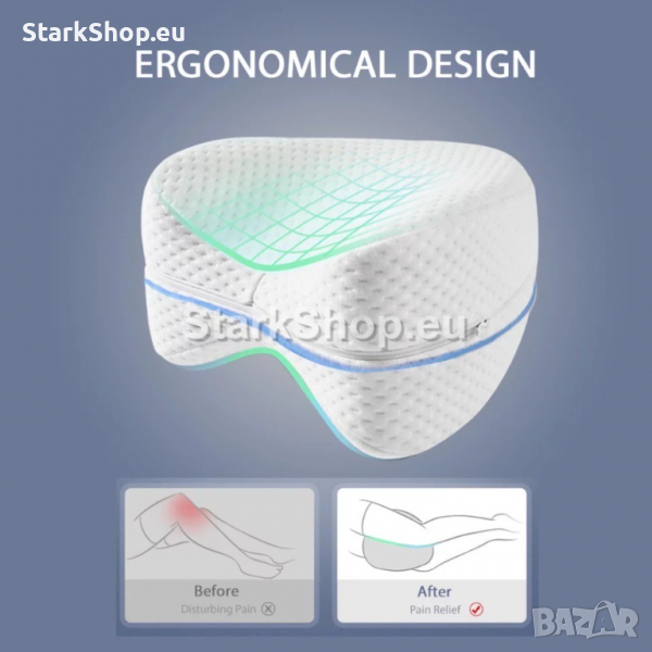 Поставя се между краката, а с ергономичния си дизайн спомага за изправянето на гръбнака, таза, облекчение в ставите, като поддържа краката в изправена позиция и елиминира възможността от схващания и болки. Благодарение на сполучливата ортопедична форма и мекотата от мемори пяната, тялото заема правилна позиция, напреженията изчезват и сънят е много по-здравословен и спокоен. Материята е дишаща, като не запарва, не изпотява, а калъфката може да се сваля и пере в пералня. Заоблените краища придават на коленете пълен набор от мобилност, за да позволят да се движиш през цялата нощ.