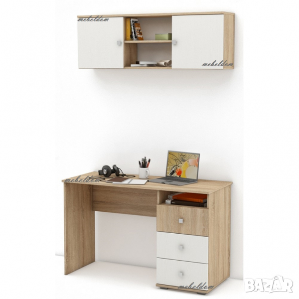 Бюро 120см. с 3 чекмеджета и надстройка с плавни врати (код-1210) цветове-Дъб Сонома+Бяло,ВЕНГЕ,Млечен дъб,ОРЕХ,БУК,Дъб Сонома,Светло сиво или БЯЛО