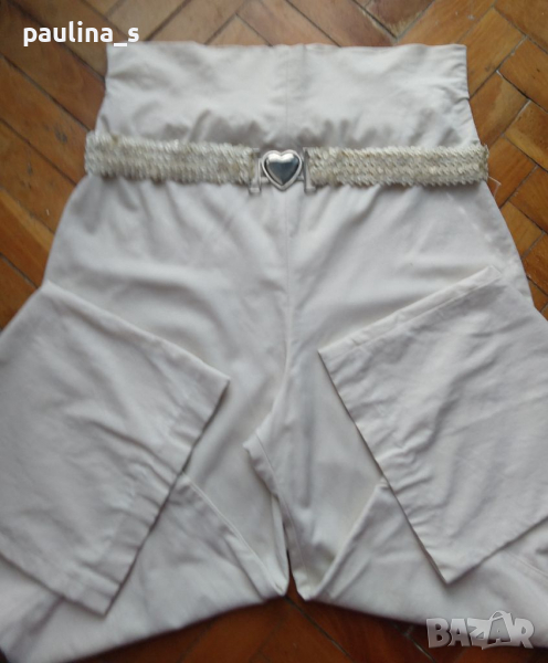 1. Дамски панталон с висока талия и широки крачоли, колан с пайети и сърце тока. Коланът е на цена 9,99лв, не се делят. Моделът е обран, материята е еластична и покрива няколко размера - коприна и еластан. Цветът е Слонова кост. Без забележки.
