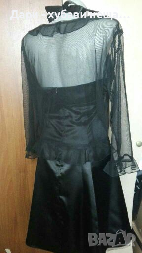 Дължина 85/89см. - сатенена част/с тюла, Широчина под мишниците от 44 до 50см.Широчина под гърдите от 40 до 41см.Широчина при ханша 51-54 см.Отлично стстояние!Изработена е от плътен еластичен сатен.Подходяща е за дама с по-пищен бюст, носеща М, или M/L.Полата завършва с широка къдра ит кристален тюл, който държи долната част кокетно в страни.Мога да предложа болерото от снимките, както и сатенени и още тюлени и дантелени болера, с отстъпка от цената, за комолекта.