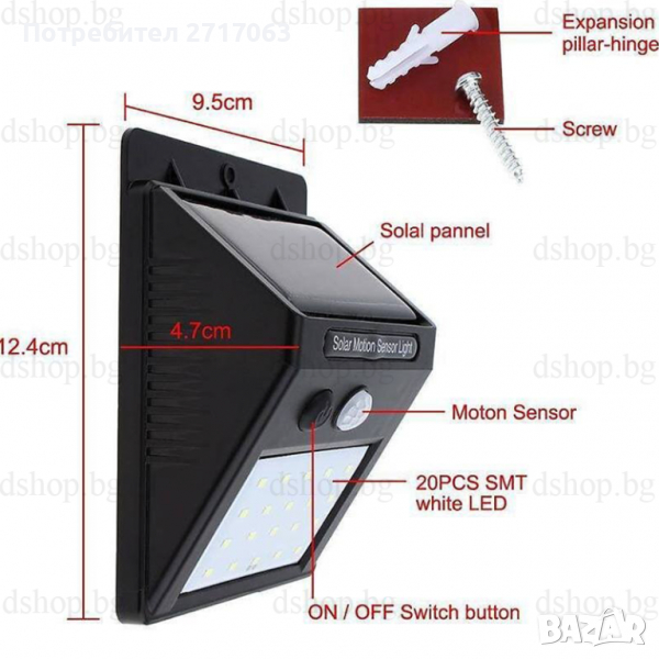- Зарежда се чрез слънчевата светлина през деня и светва в тъмното, при наличие на движение в радиус до около 3 метра.