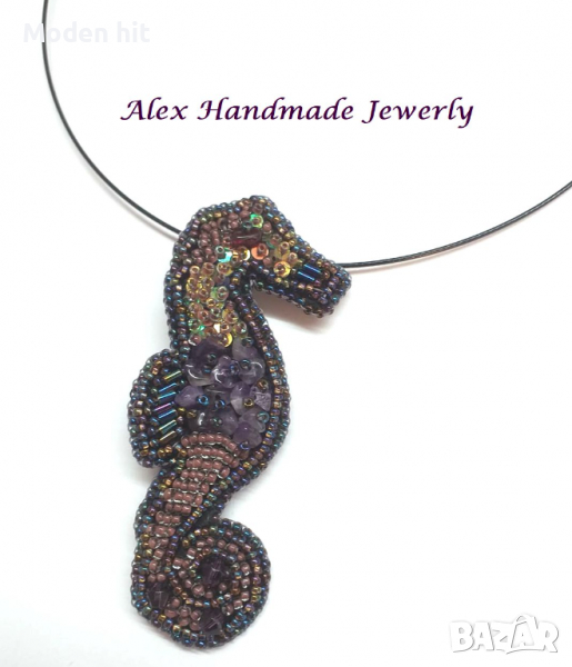 Морско конче брошка/колие с аметист /бродерия с мъниста и камъни/ Материали: Preciosa sead beads, естествен камък - аметист, кристали, пайети, естествена кожа.