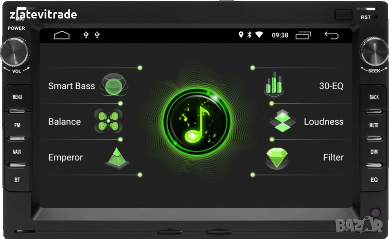 - 45 W вграден усилвател, еквилайзер, реглаж предни/задни/леви/десни говорители; възможност за инсталиране на други програми за по-добър звук