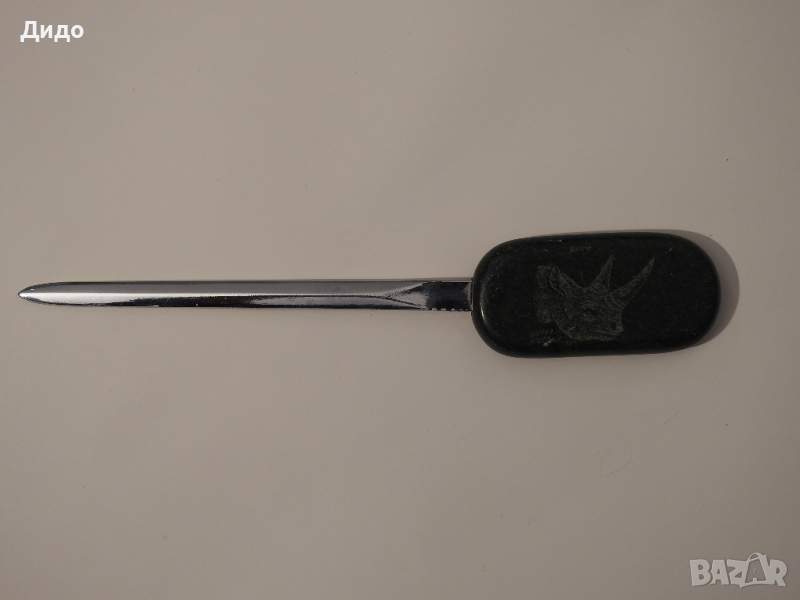 Нож за писма с дръжка от тежък зелен камък, вероятно гранит.