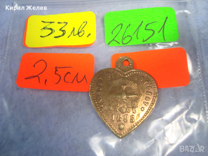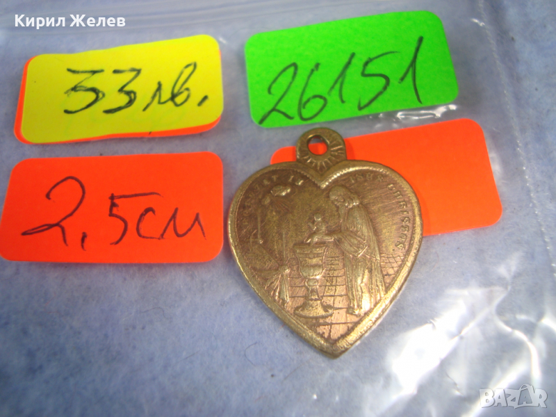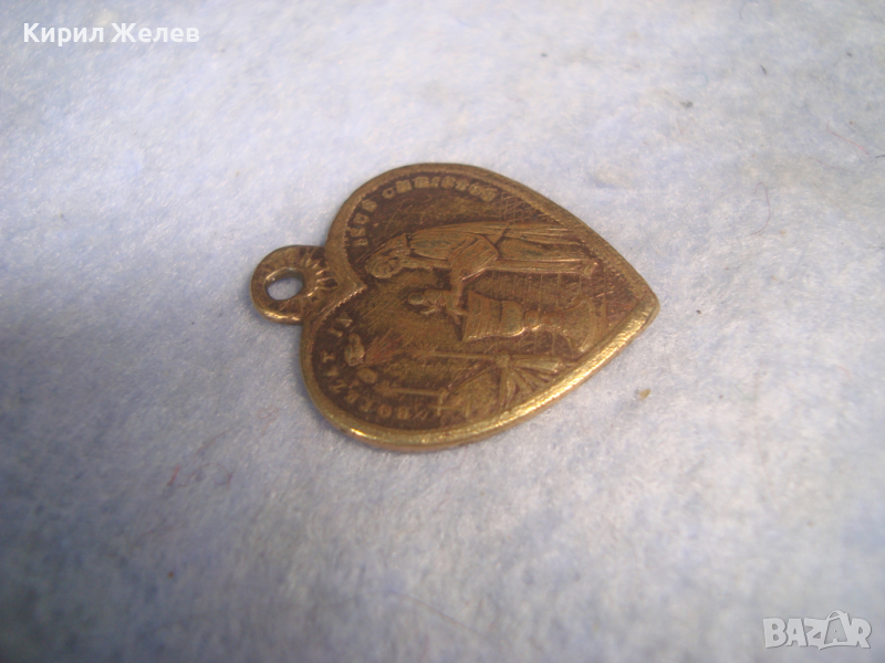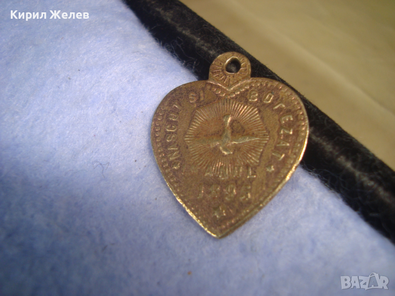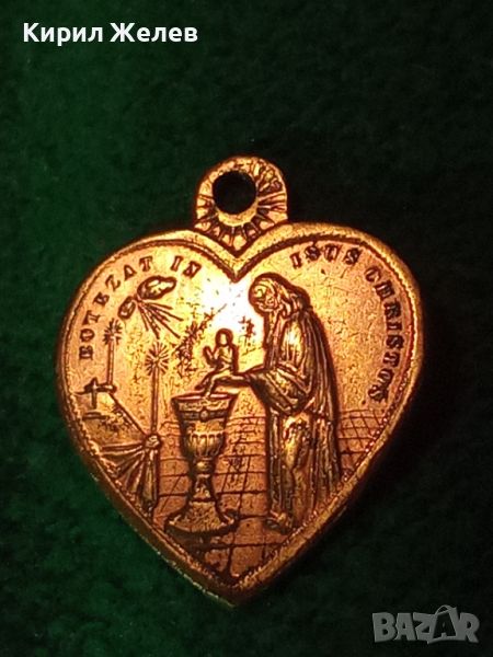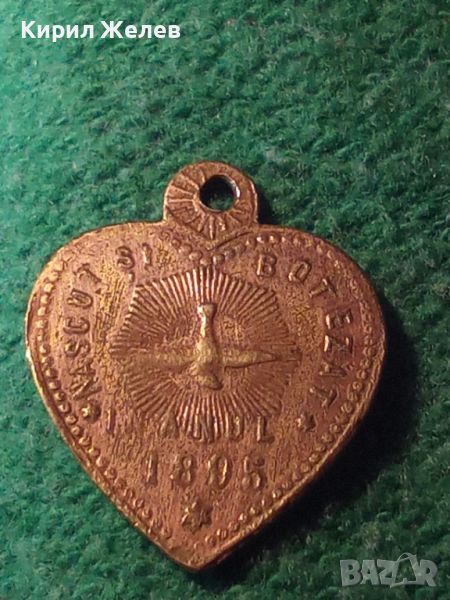 1895г. СТАР ДВУСТРАНЕН МЕДЕН с ПОЗЛАТА РЕЛИГИОЗЕН СЪРЦЕВИДЕН МЕДАЛЬОН ИКОНКА КАТОЛИЧЕСКА РЯДКА 26151