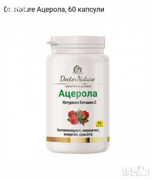 Естествен витамин C за силна имунна система, тонус и дълголетие! Ацеролата е плодът с най-високо съдържание на натурален витамин C!Всяка капсула съдържа 200 мг. стандартизиран екстракт от плодове на Ацерола (Malpighia glabra L.), от които 100 мг. витамин С (50 %).Витамин С осигурява сигурна защита срещу вируси и настинки, но не само това. Той е мощен антиоксидант, подпомага имунитета, дихателната, опорно-двигателната система, осигурява здрави стави, кожа, коса, нокти, кости, забавя процесите на стареене.Изборът на напълно натурален витамин С от плодове на Ацерола е гаранция за висока ефективност и надежден резултат.Doctor Nature препоръчва за подпомагане при:Повишен риск от грип, настинки, алергии, вирусни и бактериални атакиПонижен имунитет и често боледуване, както и за по-бързо възстановяванеПовишено физическо и психическо натоварванеРабота в замърсена средаЖелязодефицитна анемияДетоксикация на организмаПовишено кръвно наляганеАртрит, ревматизъм, проблеми с костите, зъбите и венцитеПроблемни кожа, накъсана коса и чупливи ноктиРиск от очни проблеми, особено с напредване на възрасттаЗащо Dr. Nature АцеролаОсигурява Витамин С (аскорбинова киселина) в най-активната натурална форма – от плодове на ацерола. Доказано е, че естественият витамин С се усвоява по-добре от синтетичната аскорбинова киселина.Ацерола е сред най-богатите естествени източници на витамин С в природата - съдържа между 50 и 100 пъти повече витамин С от портокалите и лимоните.Притежава висок антиоксидантен капацитет.Dr. Nature Ацерола осигурява не само витамин С, но и много други витамини и полезни минерали, съдържащи се в полда на ацеролата: витамин A (бета каротин), много витамини от група В, калций, калий, желязо и магнезий, фибри, протеини и мастни киселини.ДействиеПлодовете на ацеролата, основна съставка на хранителната добавка Dr.Nature Acerola, съдържат много фитонутриенти като фенолни каротеноидни съединения, антоцианини и флавоноиди, които имат силни антиоксидантни свойства и са синергични с аскорбиновата киселина. Научно е доказано антимикробното, хипогликемичното и хепатопротективното действие на ацеролата.Силна антиоксидантна активност и подкрепа на имунитетаНивото на витамин С е показател за здравето на тялото. Аскорбиновата киселина участва в редокс реакциите (процеси, които водят до модификация на състоянието на окисляване от съединенията), регулирането на въглехидратния и протеиновия метаболизъм и синтеза на много хормони. Витамин С повишава неспецифичната устойчивост на организма и нормализира имунната система.Проучвания показват, че витамин С може да увеличи антиоксидантния капацитет на организма с цели 30 процента.Витамин С е полезен като имунен стимулатор и модулатор и поддържа различни клетъчни функции както на вродената, така и на адаптивната имунна система. Витамин С заема ролята на бариера срещу патогени и предпазва от различни инфекции.Повишава усвояването на желязоЕдно от най-важните совйства на витамин С е способността му да засили усвояването на желязо. Консумацията на 100 милиграма витамин С увеличава усвояването на желязо с 67 процента. По този начин се предотвратяват проблеми като желязодефицитна анемия. Насърчава съсирването на кръвта.Тъй като е силен антиоксидант, витамин С осигурява защита на кръвоносните съдове, подобрява работата на капилярите и о