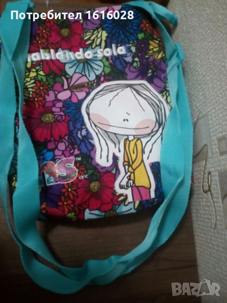 Чантичката е с наситени цветове с изрисувани цветя.С едно голямо отделение затварящо се с цип.От външната страна има допълнителен джоб,затварящ се с велкро.Нова без забележки,вижда се къде е бил етикета,който е свален.С дълга регулираща се дръжка.