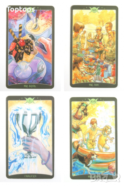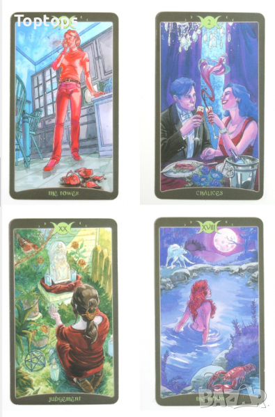 - 78 таро карти The Book of Shadows Tarot So Below заедно с pdf файл с инструкции на английски. Размерът им е 10,5см х 6,3см. Колодата е създадена от Barbara Moore.