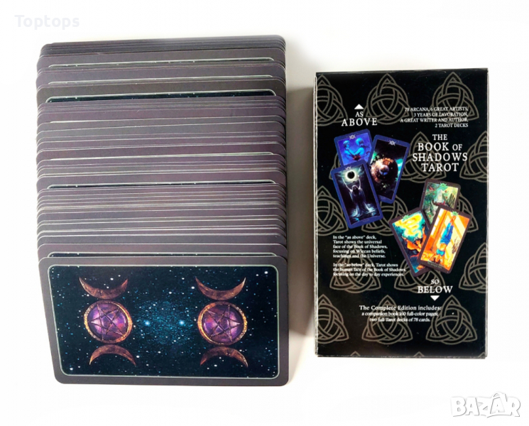- 78 таро карти The Book of Shadows Tarot As Above заедно с pdf файл с инструкции на английски. Размерът им е 10,5см х 6,3см. Колодата е създадена от Barbara Moore.