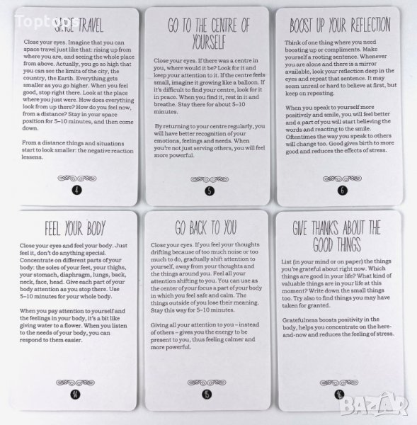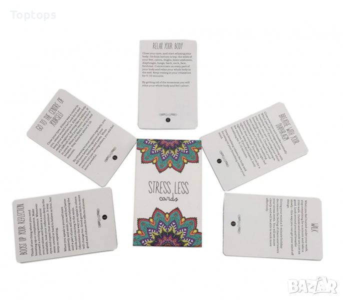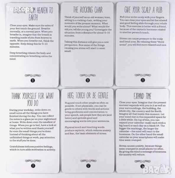 * Stress Less е ресурсна оракул колода. Има 40 карти и всяка от тях дава реални практически приложими напътсвия за справяне със стреса и преодоляване на напрегнатите и тежки състояния.
