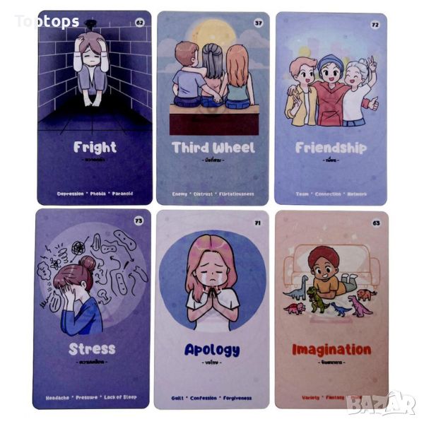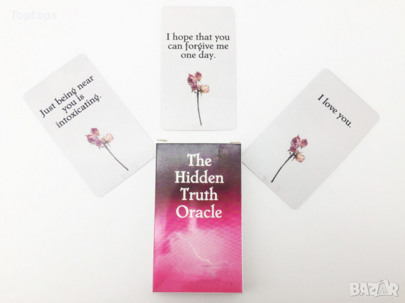 - 54 оракул карти - The Hidden Truth Oracle. Размерът им е 10,5см х 6,3см, колодата е създадена от All Things Intuitive.