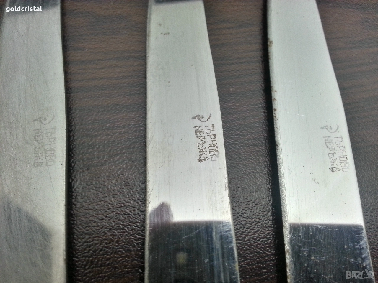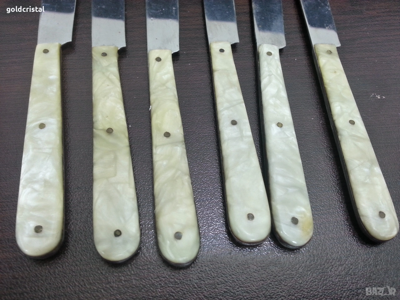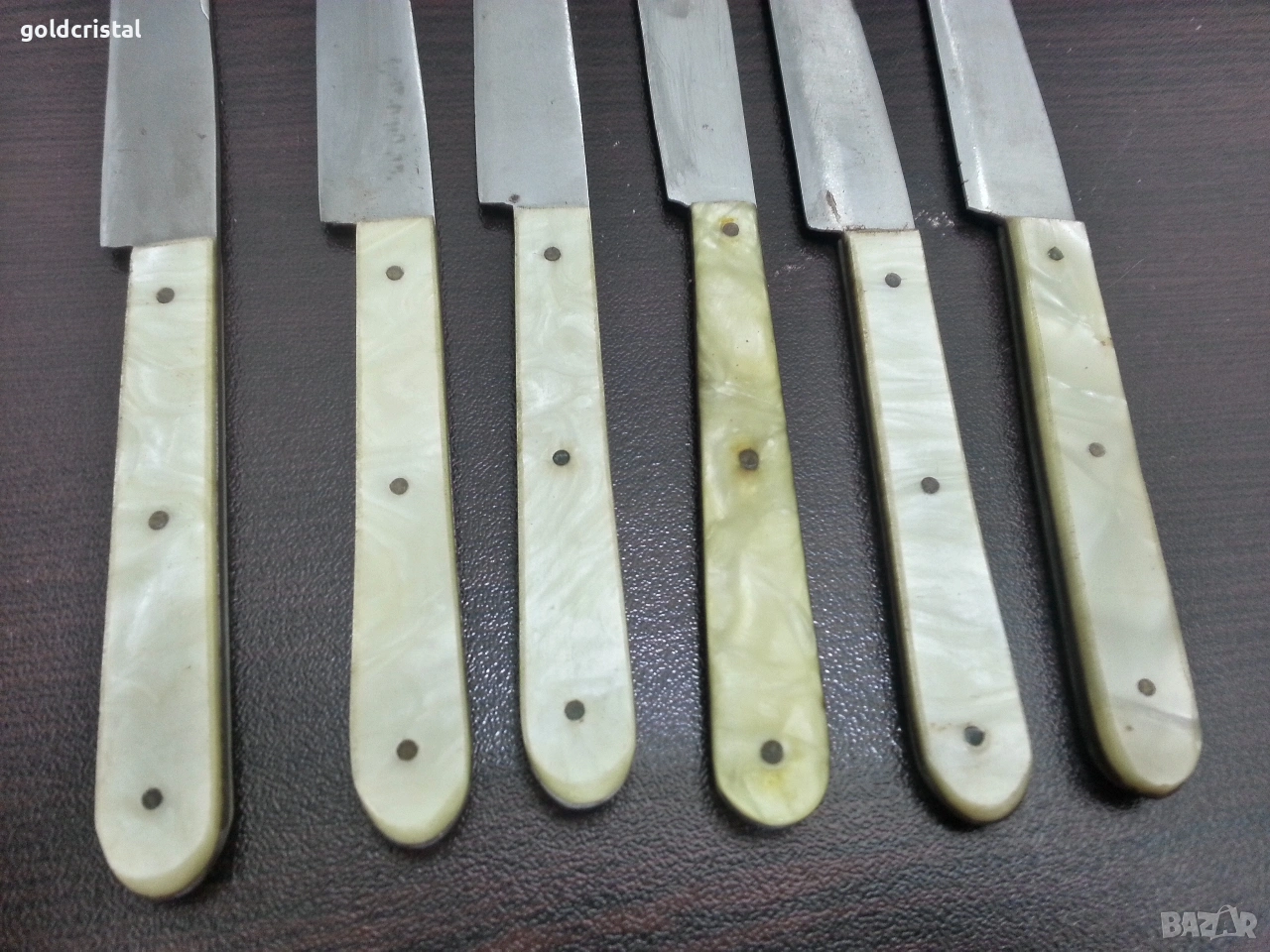 стари български ножове ножчета Велико Търново сърп и чук Петко Денев 6 бр с дръжка чирени от каталин сервиз комплект сет лот ретро арт декор винтидж колекция старинни антикварни предмети обзавеждане за дома и семейството подходящи за подарък за ценители и колекционери