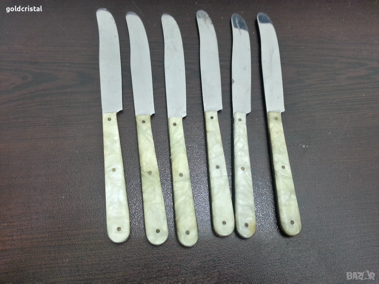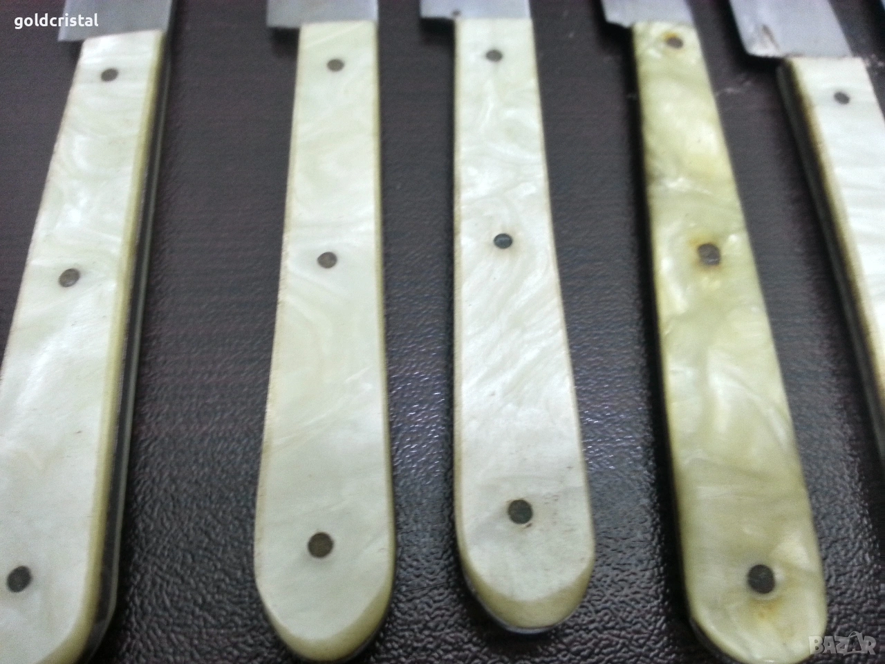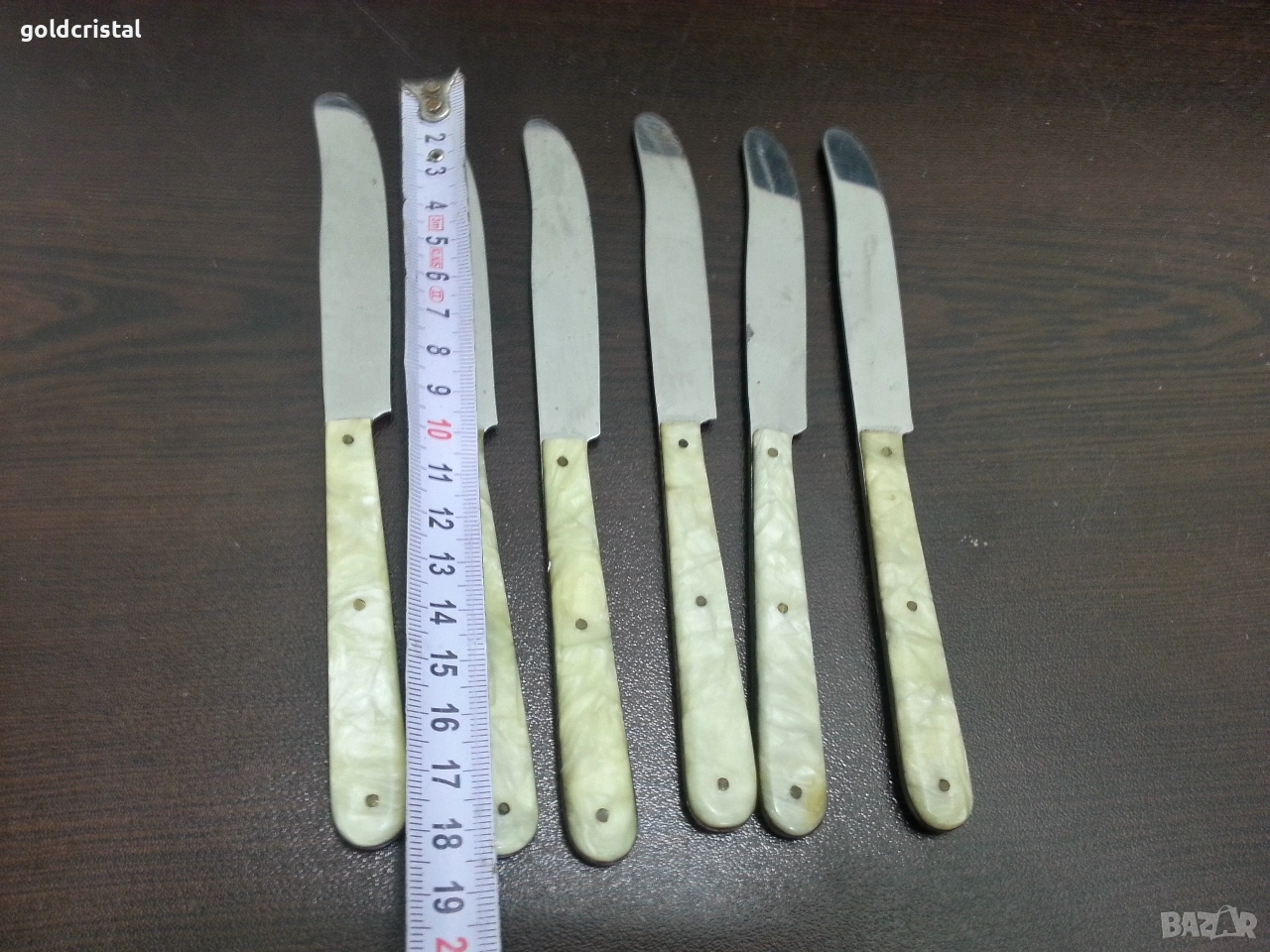стари български ножове ножчета Велико Търново сърп и чук Петко Денев 6 бр с дръжка чирени от каталин сервиз комплект сет лот ретро арт декор винтидж колекция старинни антикварни предмети обзавеждане за дома и семейството подходящи за подарък за ценители и колекционери