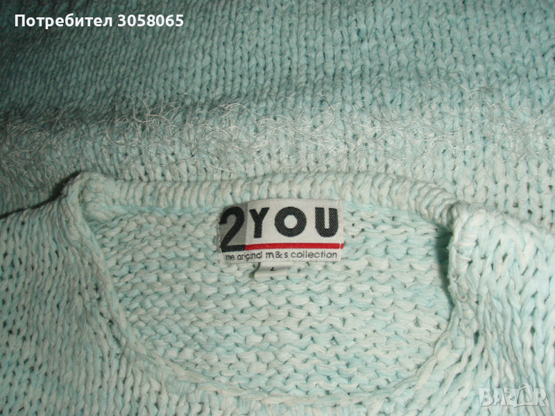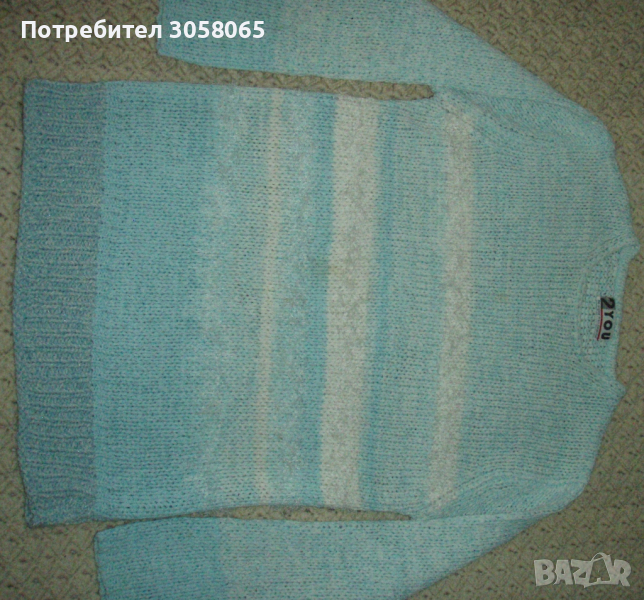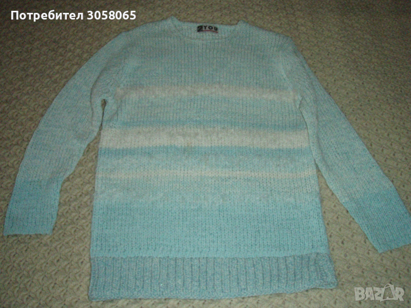 Продавам пуловер в светло синьо, смесица от бяло и синьо, по етикет размер L, но реално е XL. Без забележки.