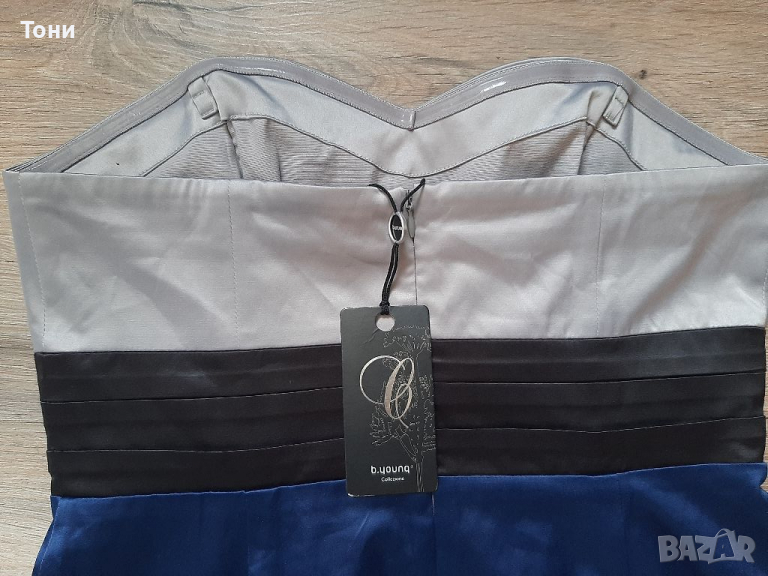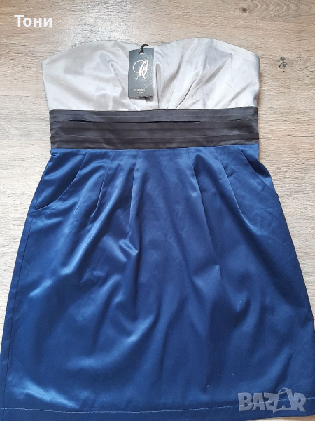 Дамска нова официална рокля. Цветове, синьо, сиво и черно. Модела е тип бюстие със силикон в горната част за добро прилепване. Долната част е ластичен сатен, с подплата. Закопчаване с цип на гърба. Бюст 54 см, талия 41 см, ханш 58 см, дължина на роклята от горната част 75 см.