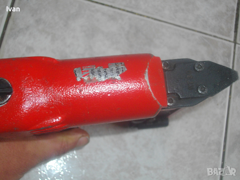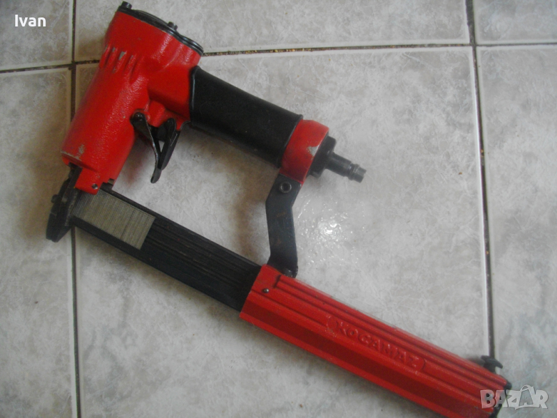 Описание на червен такер - марка и модел - KOCAMAZ KT 30. Дърводелски такер/пистолет САМО за дърводелски пирони с глава и без глава размери до макс 30 мм. Машината е професионална на труски производител на профи инструменти. Много запазен външен вид на такера и отлично техн.състояние - пробван, работи много добре ,със силен и мощен удар. Изцяло алуминиев корпус и алуминиев голям пълнител. Поставена оригинална бърза връзка за скачване с компресор. Размери на такера - ширина 170 мм, дължина - 210 мм.Стоманена глава. Масивна капачка на пълнителя, отваряне с 1 движение. Защита на спусъка-блокиравка. Гумирано инпрегнирано, нехлъзгащо се покритие на държката при захвата на ръката. Такера е зареден с дузина пирони размер 30 мм за проба и тест. Цената е твърда, не подлежи на никакъв коментар - 159 лв.