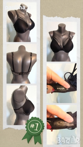 1️⃣. Колаж / L / 2XL / 80Е / "Sapph." Цената е крайна, без пазарлъци 25 евро. Луксозен сутиен, моделът и марката се виждат добре. Материята и кройката позволяват да се носи от посочените размери, само една бройка е. Подгръдна обиколка 35см до 53см едностранно.