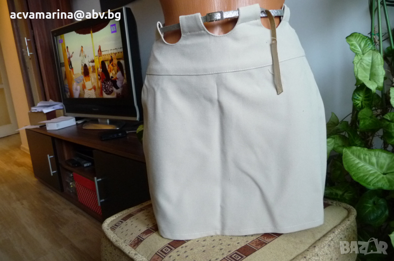 Наличен . Комплект от яке и 2 поли в цвят слонова кост.Закупени от бутик от Гърция.Якето е късо.Размерът е С.