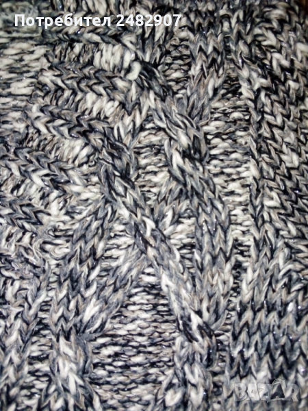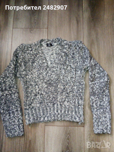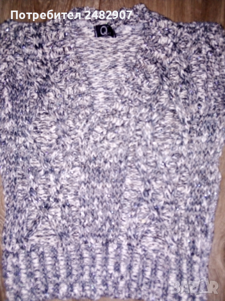 Къса дамска блуза с дълъг ръкав и остро деколте, размер XS. Машинно плетена, цвят "меланж" с блестящи нишки. Ширина в раменете - 31 см, дължина от рамото до долу - 41 см дължина на ръкава от рамото - 49 см. Много запазена.