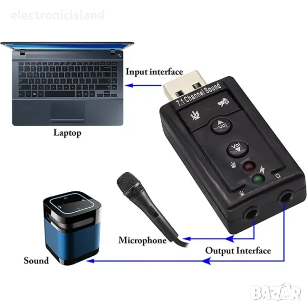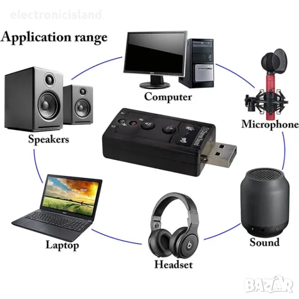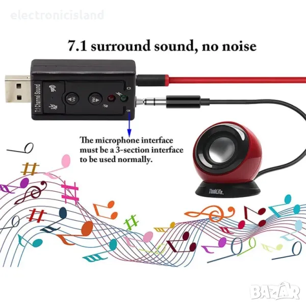 3D звук Външна звукова карта 7.1 с USB, 3.5 мм жак микрофон / стерео слушалки, адаптер за компютър