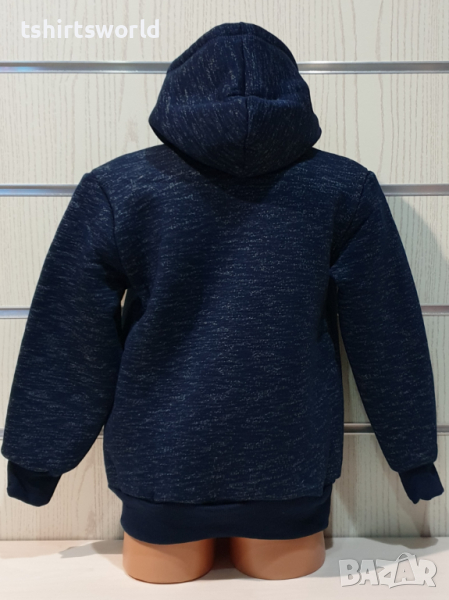 в цвят тъмносин меланж с качулка и дигитален печат
