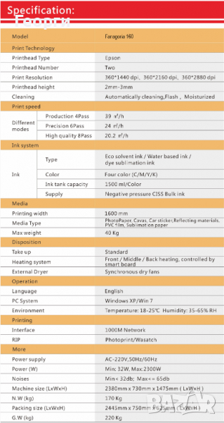Нов еко-солвентен принтер за стартиращ бизнес в печатната сфера.Всички спецификации са показани на втората картина