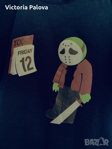 Хубава тъмно-синя тениска без шевове,интересна щампа,неупотребявана.рамене-52см,ГО-58см,дължина-70см.