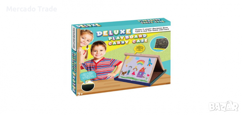 Цветна двустранна дъска с дървена рамка, която се сгъва и затваря за лесно транспортиране и съхранение. Едната страна е бяла дъска, подходяща за писане с маркер, а другата страна е черна дъска за тебешир.