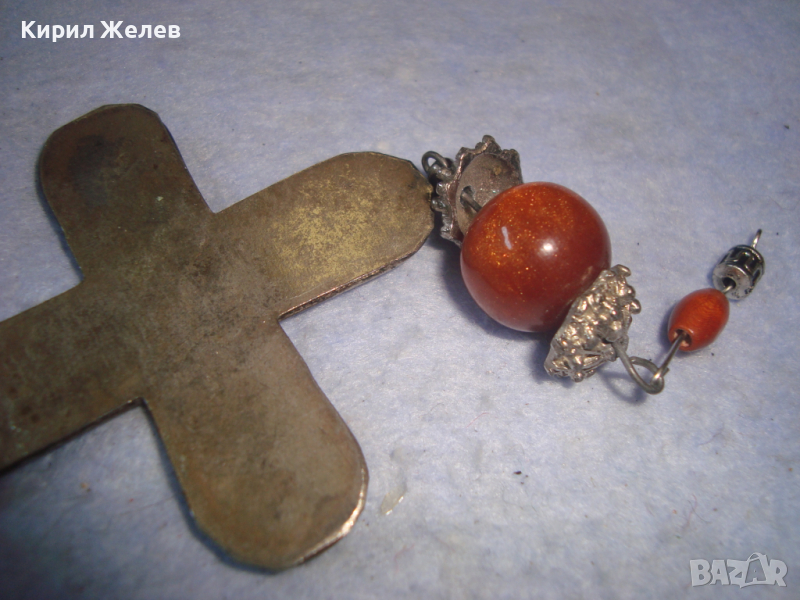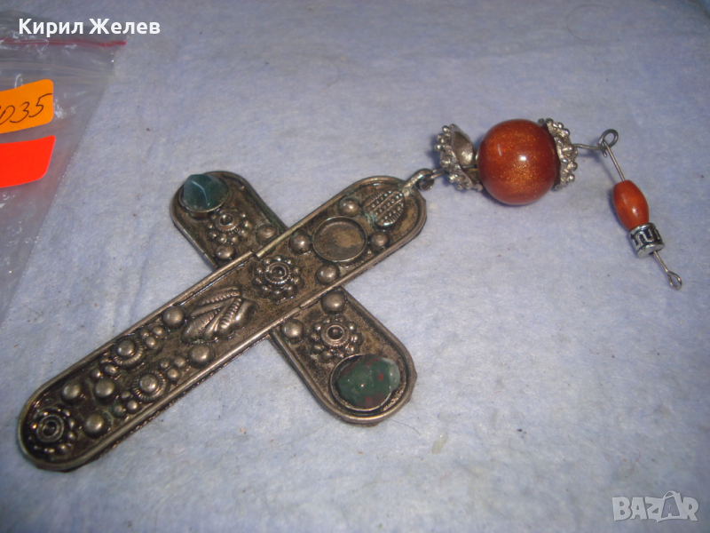 ГОЛЯМ СТАР СРЕБРИСТ СТИЛНО ОРНАМЕНТИРАН НАГРЪДЕН КРЪСТ с АВАНТЮРИН ТОПЧЕ КАМЪЧЕТА 19035