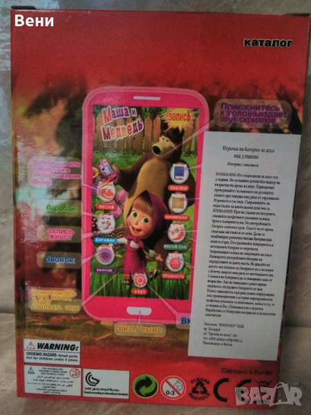 Забавен детски образователен смартфон на руски език "Маша и мечока". Има много песнички и приказки на руски език, а също и мелодии. Различни рингтонове и функция за запис и възпроизвеждане. Реагира при докосване, като издава различни звуци. Регулиране силата на звука, фенерче. Работи с батерии 3/1.5v.(изпращам за проба). Размери 14/7/1,5см.. Размери на кутията 17/12/2,5см. Изпращам с Еконт или Спиди, с преглед и тест!