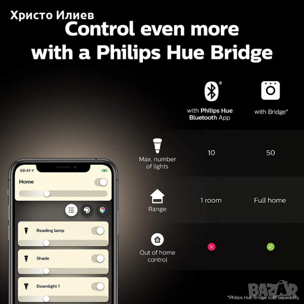 Какво се поддържа: Приложение Philips Hue: IOS 11 и по-нова версия, Android 7.0 и по-нови. Гласови асистенти: Apple HomeKit (Via Hue Bridge), Microsoft Cortana (Via Hue Bridge). Приложение Philips Hue Bluetooth: IOS 11 и по-нова версия, Android 7.0 и по-нова версия