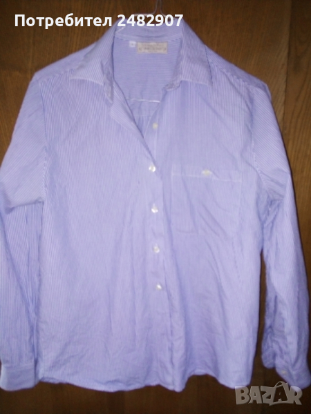 Дамска риза на раета в синьо и бяло с джоб. Размер S, ширина в раменете - 38 см, дължина от рамото до долу - 63 см, дължина на ръкава от рамото - 57 см. Много запазена.