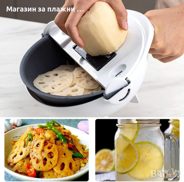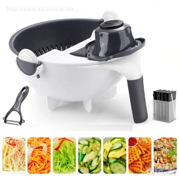 Купата – ренде не е твърде обемна и е много лесна за почистване, тъй като е разглобяема. Приставките – рендета са седем на брой и имат различни предназначения, в зависимост от крайния продукт, който искате да получите – от ситно настърган морков и краставица, през слайсове домат или тиквичка до гофрирани слайсове за пържени картофи. Отделно към уреда притежавате и пластмасова ръкохватка със специален шиш, към които да прикрепяте твърдите зеленчуци, особено кореноплодните. Така можете да стържете, без да се притеснявате от нараняване на пръстите си. В добавка към всичко това получавате и удобна идеално наточена пластмасова белачка.