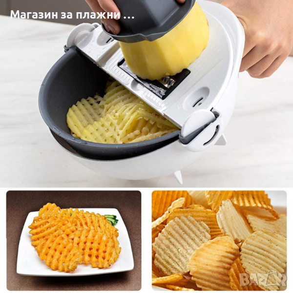 Купата – ренде не е твърде обемна и е много лесна за почистване, тъй като е разглобяема. Приставките - рендета са седем на брой и имат различни предназначения, в зависимост от крайния продукт, който искате да получите – от ситно настърган морков и краставица, през слайсове домат или тиквичка до гофрирани слайсове за пържени картофи. Отделно към уреда притежавате и пластмасова ръкохватка със специален шиш, към които да прикрепяте твърдите зеленчуци, особено кореноплодните. Така можете да стържете, без да се притеснявате от нараняване на пръстите си. В добавка към всичко това получавате и удобна идеално наточена пластмасова белачка.