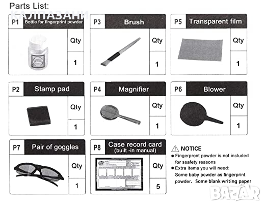 Включено е ръководство с инструкции стъпка по стъпка как да направите пръстовите отпечатъци видими, да повдигнете отпечатъка и как да съхранявате информация за пръстови отпечатъци с помощта на включените класификационни карти.