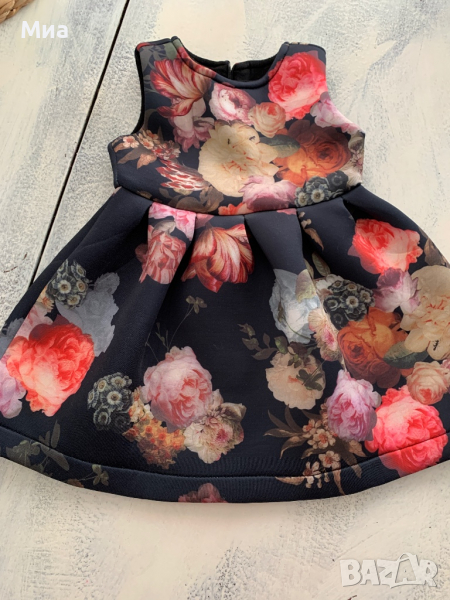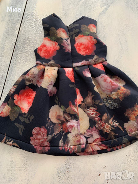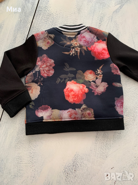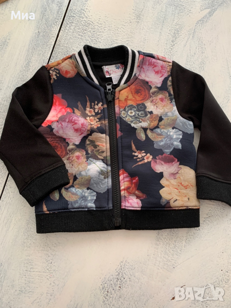 Бебешки комплект от две части, яке и рокличка във флорален мотив, размер 74 см / 12 месеца така пише по етикет, якето е слагано 2-3 пъти, роклята е НОВА. Без забележки.