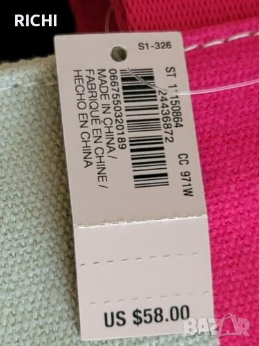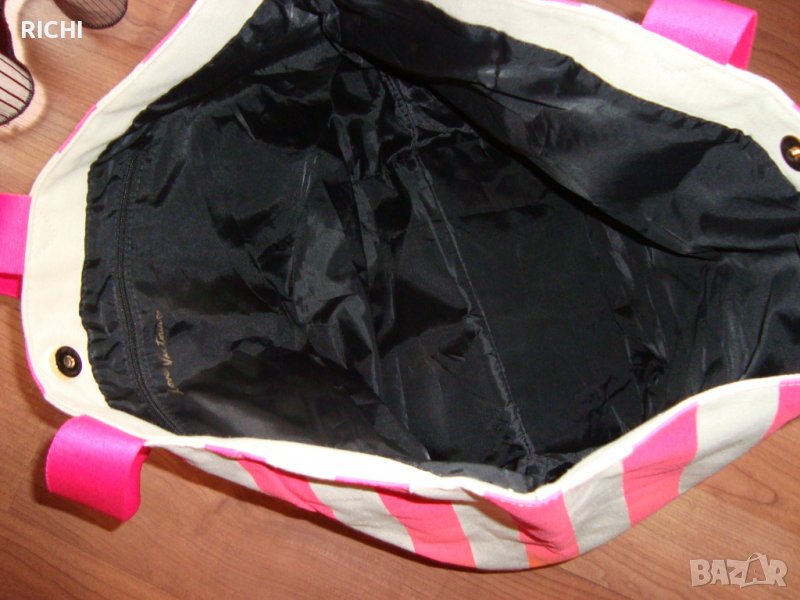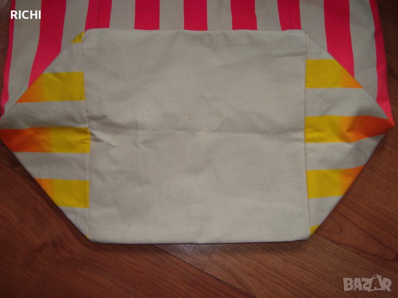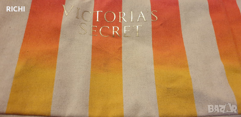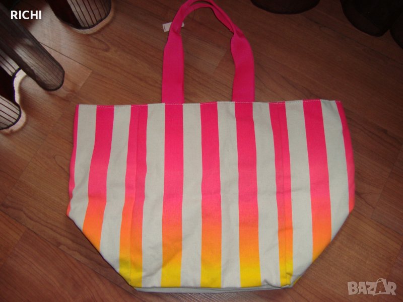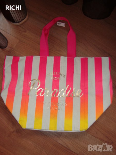 Victoria Secret Greetings From Paradise - Модел: Поздрав от рая на Victoria's Secret. Нова с етикет мострен модел с бегли следи от пипане и липсва пискюла от каталожните снимки. Тази чанта в стил плажен шик е готова с място за всички задължителни неща за вашето бягство през лятото било на плаж или разходка. Залязващо слънце ивици внасят летен стил във всяка визия с красивите си преливащи цветове. Закупена за 58$ видимо от етикета.