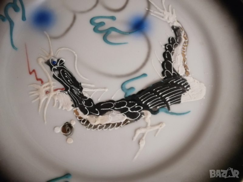 Японските литофанови чаши излизат от производство в началото на 60-те години на миналия век. Тези картини (обикновено образи на Гейша) се създават чрез промяна на дебелината на обикновен бял порцелан, за да се създаде дизайн, който се вижда само когато се държи до източник на светлина (както бихте могли да направите, когато пиете от чаша чай). Почти триизмерно изглеждащият дракон от външната страна (така нареченият висок релеф) е направен с техниката мориадж, вид декорация от плъзгаща се глина, използвана за керамика, която придава повдигнат, обемен вид.