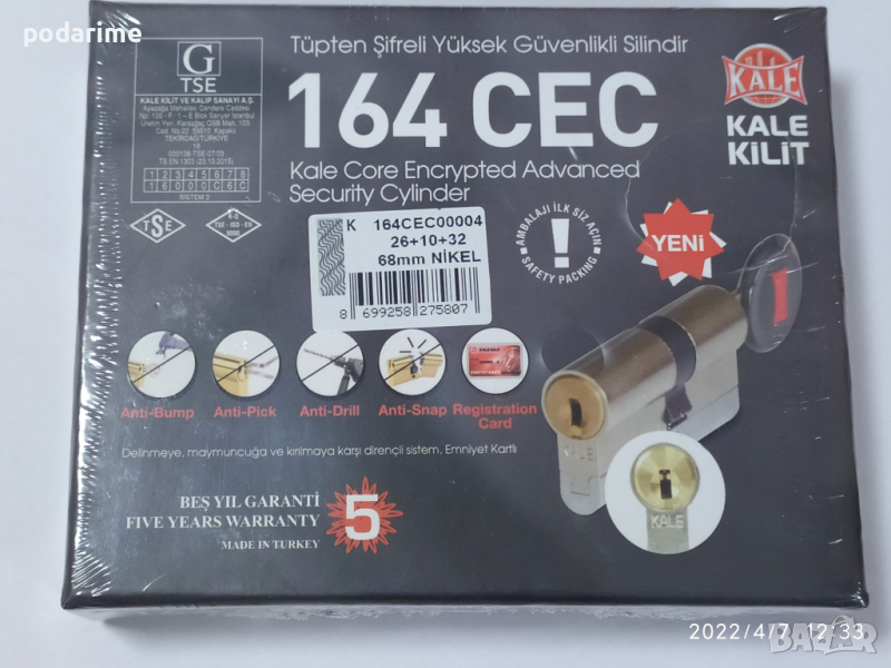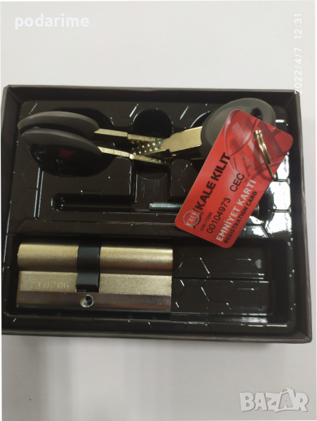 Предлагам патрон Kale с дължина 31/37 мм, с 5 ямкови ключа. Има вграден в корпуса стомамен пин, за изключително голяма устойчивост и защита. Палеца е по DIN стандарт. Изработен от стомамена сплав, предпазваща патрона от взлом. Ключалката е със специална система за защита срещу чупене, пробиване и отваряне със шперц. Корпуса е подсилен с два стоманени анти-пробивни щифта с висока якост. Щифтове: Специално разработен месинг MS 58; Здрава на пробиване стомана HRC 60, Подходящ за всички видове турски врати Cassa, DAF, MEGA, KALE,FERI, YALE.