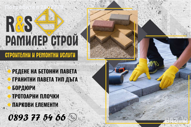 павета ; (уни павета, кокалчета и др.)-редене на гранитни павета(тип дъга);-редене тротоарни плочи;-редене на паркови елементи;-редене на гранитни бордюри;-рдене на бетонни бордюри;-полагане на дъждовни улеи;-озеленяване и подръжка;-монтаж и демонтаж на павета;-полагане на ВиК тръби;-редене на мозайка;-другиИНФОРМАЦИЯ:За допълнителна информация цена и оглед моля обадете се.РАБОТНО ВРЕМЕ:От Понеделник до неделя 7:00-19:00