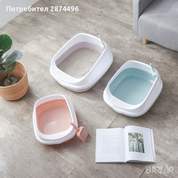 Котешка тоалетна с борд и модерен дизайн. Високия борд задържа поселката и урината вътре в тоалетната. Нисък вход за лесен достъп. Заедно с котешката тоалетна получавате и лопатка/сито, която се закрепва за самия леген