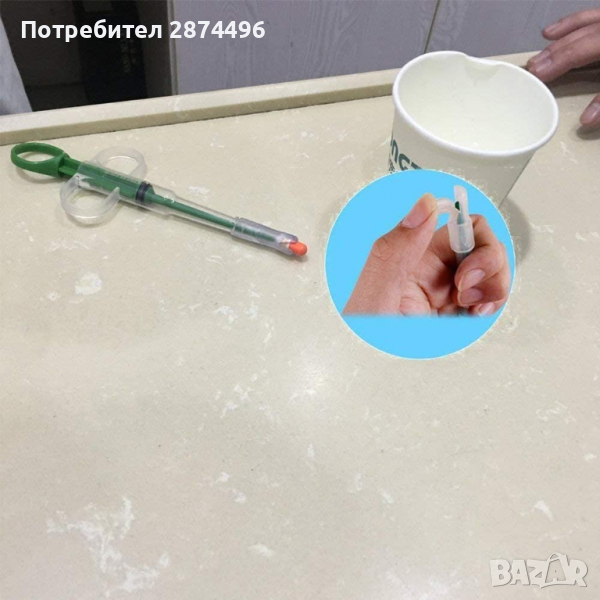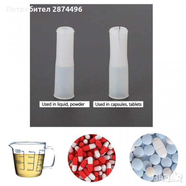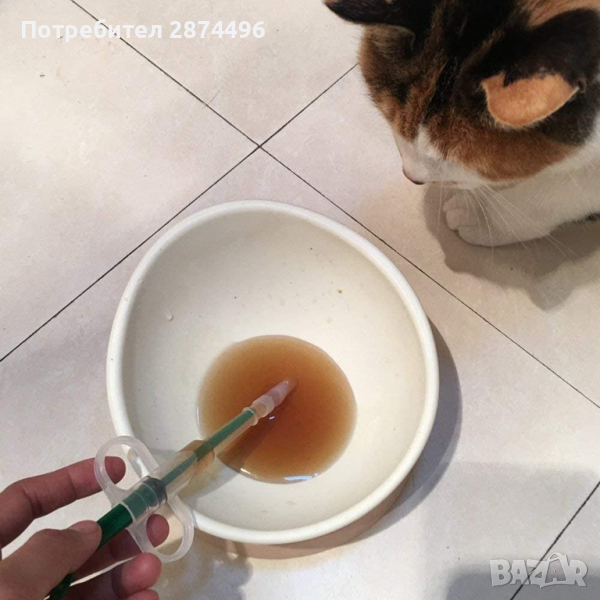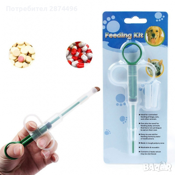 Уред за хранене или подаване на лекарства за животни . Комплекта се състои от 1 спринцовка и 2 накрайника , единият накрайник е разцепен за поставяне на хапчета . Уредът е подходящ за подаване на храна на малки или стари , болни животни , както и придаване на лекарства течни или на хапчета директно в гърлото . Подходящ за кучета , котки ,и други домашни и стопански животни : птици , овце , кози , кончета и др .