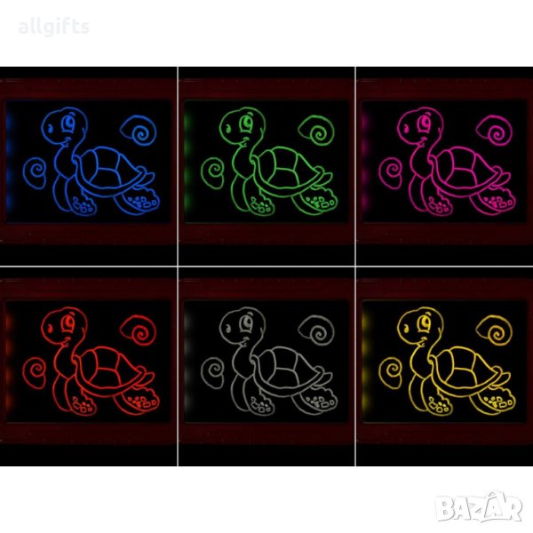 Страхотен магически светещ детски таблет за рисуване. Много практичен и удобен за вашето дете. За да го "пуснеш в действие" са нужни 3 броя батерии ААА. Има специален отвор, през който да пъхнеш занимателните карти. От копчето отпред се пускат светлините. Имай предвид, че те не се сменят автоматично! Тази опция я има и се задейства след цвета БЯЛ. (това е около 7-8 натискане на бутона).