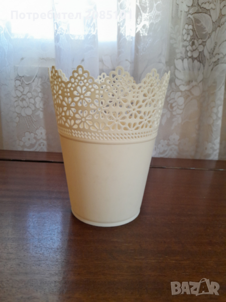 1. Кашпа пластмаса бежова дантела. Височина 18см., диаметър 14см., диаметър на дъното 9,5см. - 1€.
