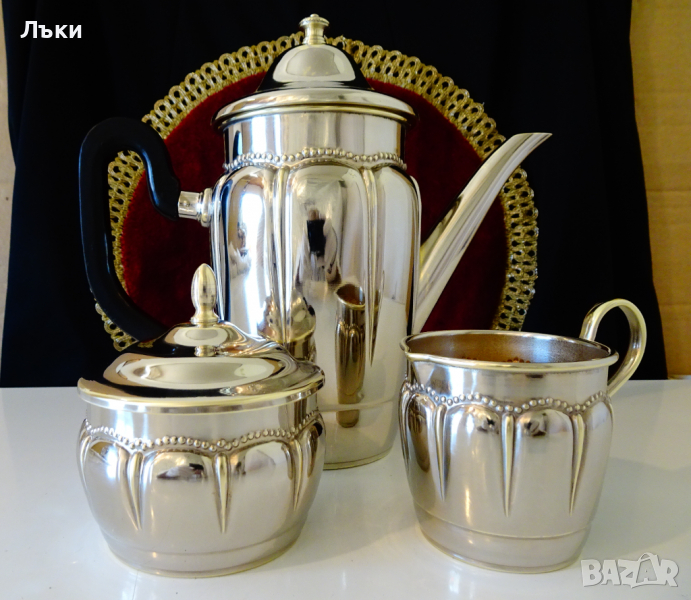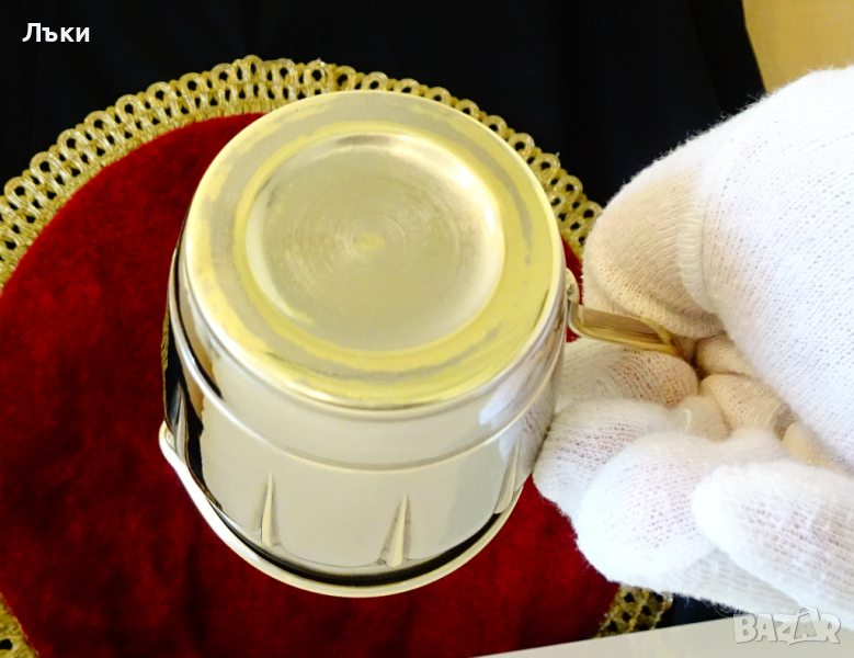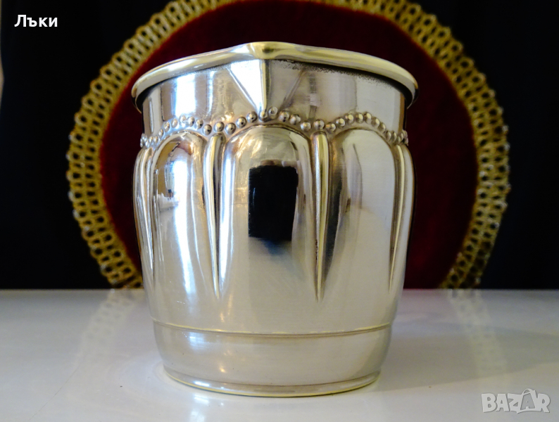 от високо качествен месинг,дебело посребрена с висока проба сребро,родирана за блясък и трайност.Изключително красива,декорирана с ръчно кован разкошен релеф.Височина 8 см.,диаметър 6.5 см.,тегло 60 гр.Вместимост 160 мл.